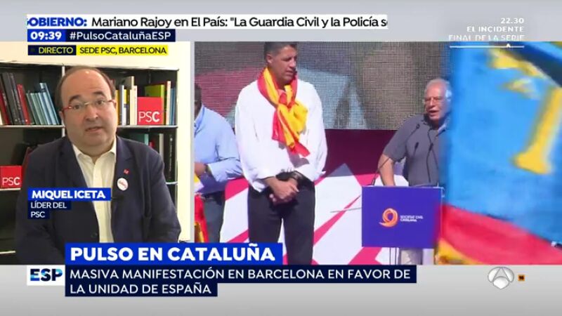 Sobre la manifestación que se celebró este domingo a favor de la unidad de España, el PSC considera que "Sociedad Civil no es un frente de partidos", por lo que los miembros del partido no acudieron. Aun así, Miquel Iceta ha asegurado que Josep Borrel "puso voz a muchísima gente en Cataluña".