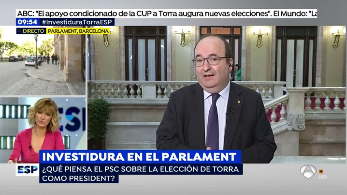 Iceta cree que Torra se "sitúa en una tesitura de continuar lo que fue la legislatura anterior y eso no merece confianza, más bien merece desconfianza. De lo que se trata es de juzgar los actos, las decisiones concretas una vez sea investido, será el momento de ver en cada decisión el sentido que tiene y por lo tanto yo no me atrevo a hacer un pronóstico. Desde luego si se hace lo que se ha dicho vamos al desastre. Si una vez conseguida la investidura y la abstención de la CUP se intenta otro camino pues habrá que ver".