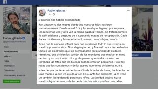 Iglesias y Montero agradecen a los que les han "acompañado" en la recuperación de sus hijos: "Todo ha sido posible gracias a los profesionales de la sanidad pública y al apoyo de nuestra gente"
