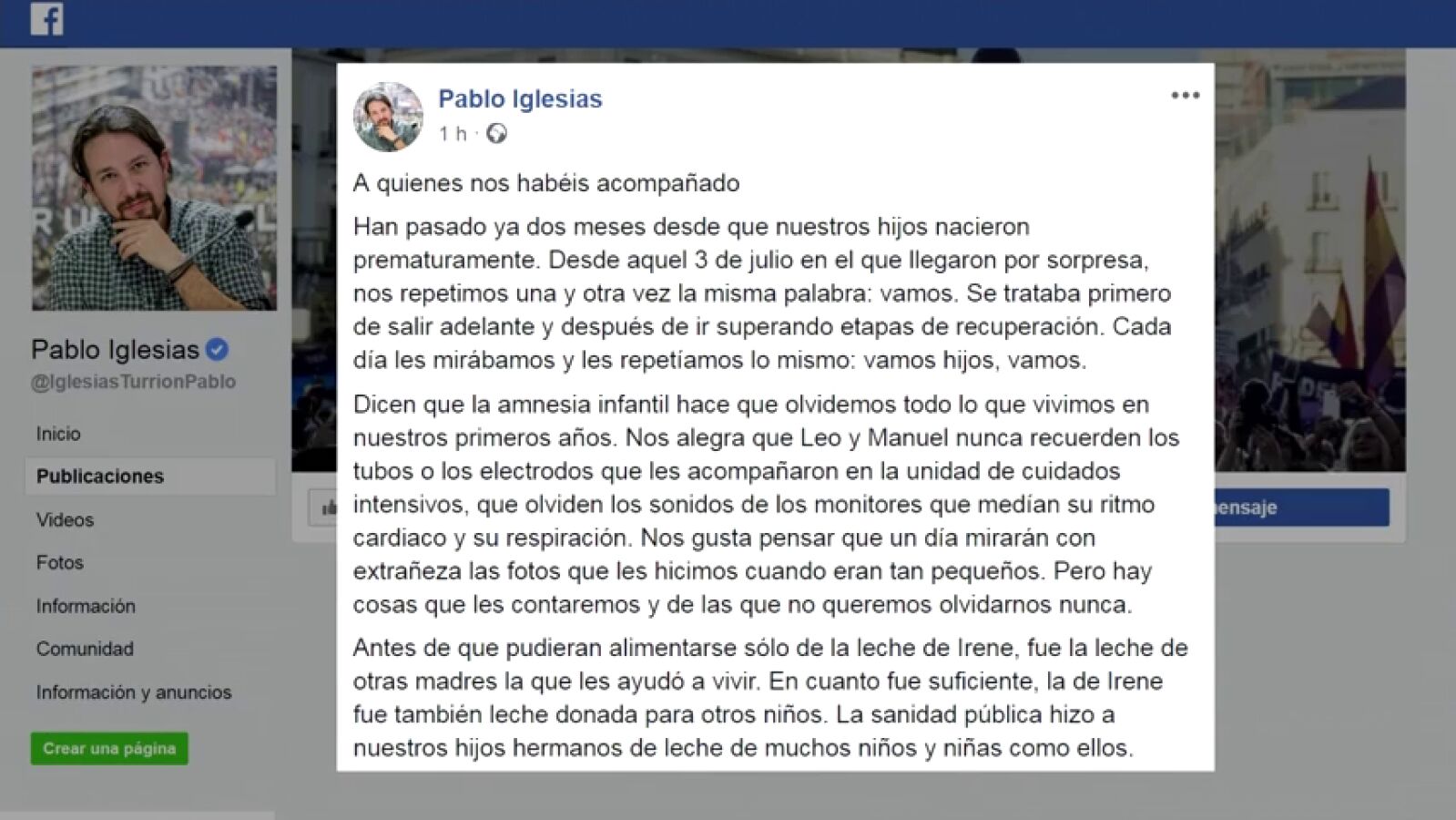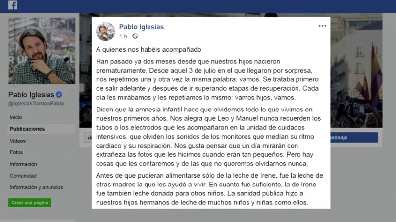El líder de la formación 'morada', Pablo Iglesias, y la portavoz en el Congreso, Irene Montero, han vuelto a la escena pública después de dos meses apartados de los focos por el nacimiento prematuro de sus dos hijos. Lo han hecho a través de un mensaje que han compartido en Facebook y Twitter, en el que han agradecido individualmente a todos aquellos que les han "acompañado" en la recuperación de los bebes a lo largo del tiempo que han permanecido ingresados en el Hospital Gregorio Marañón.
