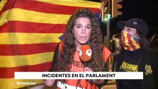 Unos 1.000 radicales, algunos de ellos encapuchados, han creado escenas de tensión en el Parlament de Cataluña. Este grupo también ha increpado a una periodista de Antena 3 Noticias.