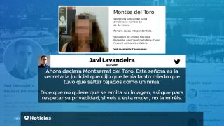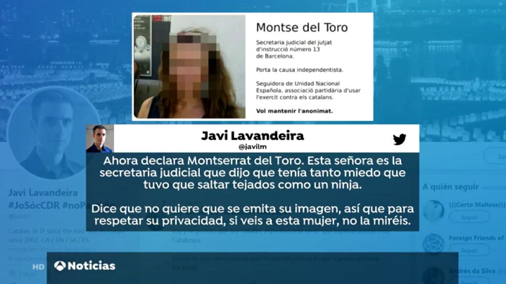 El escrito recuerda que la secretaria declaró ayer de manera oculta en el juicio del 'procés' por temor a represalias y narró el episodio de "terror y miedo ante el asedio que padeció la comisión judicial" en el registro en la Conselleria de Economía. Los letrados de la administración de justicia apuntan que Twitter España permitió ayer la difusión de la imagen de Del Toro y de las opiniones vertidas sobre su compañera. "Se ha tolerado todo. Basta ya, exigimos poner punto final al ataque hacia esta profesional", señala el manifiesto. La ministra de Justicia, Dolores Delgado, ha expresado su apoyo a la secretaria y ha subrayado que atacar a testigos "es propio de los peores totalitarismos". "Todo mi apoyo a la letrada de la Administración de Justicia del Juzgado de Instrucción 13 de Barcelona ante el linchamiento en redes sociales al que está siendo sometida por hacer su trabajo", ha escrito la ministra en su cuenta de Twitter.