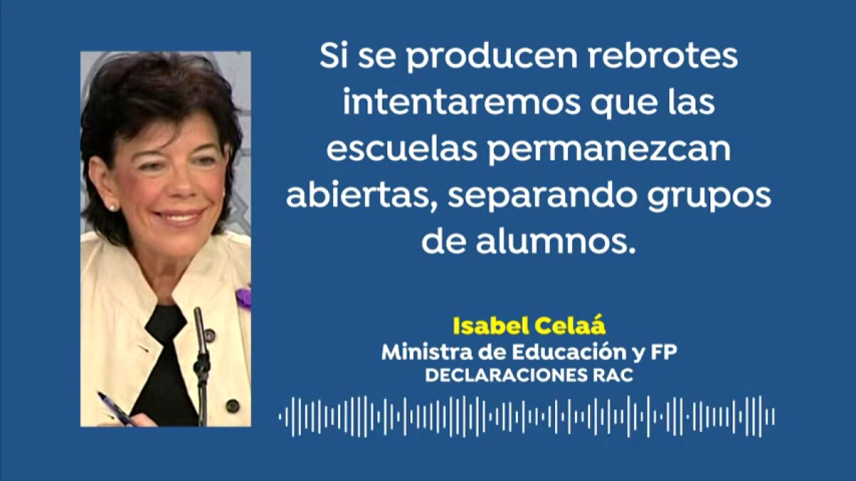 La ministra de Educación, Isabel Celaá, ha abogado por mantener la cautela aunque ha apostado por dejar los colegios abiertos en casos de rebrotes. "Intentaremos que las escuelas permanezcan abiertas" en el caso de que hubiera un rebrote, y ha añadido que se está mejor informado para detectarlos, separar grupos, perimetrar los contactos y no cerrar el centro.