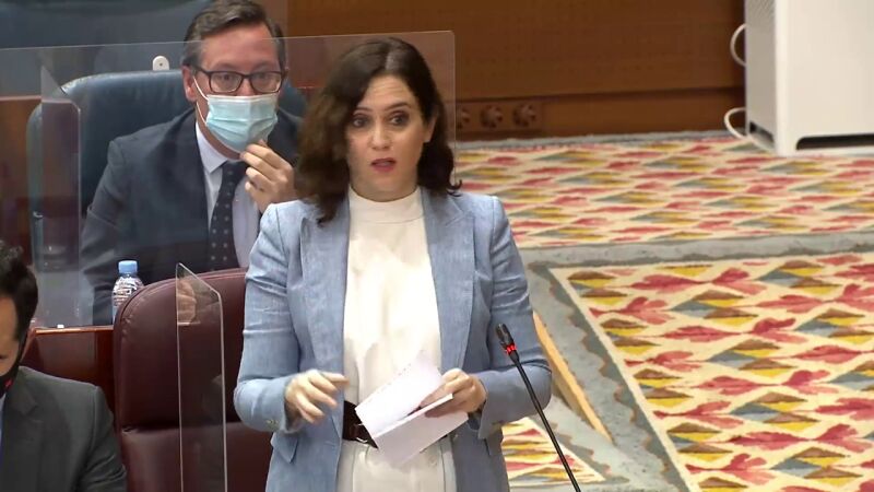 Al principio de su intervención, Ayuso ha aprovechado para condenar la agresión a un cámara y a un periodista de Telemadrid por un "activista de extrema izquierda" en "una manifestación en apoyo a un delincuente", en alusión al rapero Pablo Hasel, que espera entrar a la cárcel por su condena por enaltecimiento del terrorismo e injurias a la corona.