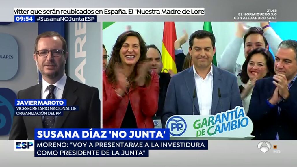 El vicesecretario Nacional de Organización del PP, Javier Maroto, celebra en una entrevista en Espejo Público los resultados obtenidos por su partido en las elecciones andaluzas y cree que es normal la euforia que se vivió anoche porque "se produce una posibilidad de un hecho histórico que es poner fin a un régimen socialista que duraba 40 años".