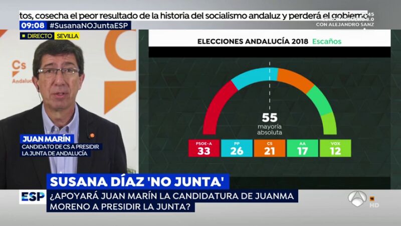 El candidato de Ciudadanos a la presidencia de la Junta, Juan Marín, ha emplazado a la presidenta en funciones y candidata del PSOE, Susana Díaz, a plantearse "poder apoyar" un gobierno de su partido, al que tras los resultados electorales ve "legitimado" para presidir Andalucía.