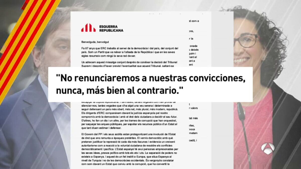 Los principales líderes de ERC, Oriol Junqueras y Marta Rovira, puntualizan en una carta dirigida a la militancia que no renunciarán a sus convicciones y que se reafirman "en todas y cada una de ellas", aunque en el texto obvian toda referencia a la independencia, y piden a los catalanes que no se dejen "provocar" hacia la "confrontación".