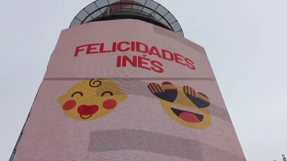 Ciudadanos ha querido felicitarla con una curiosa iniciativa en plena calle: una pantalla gigante con una felicitación en la que se puede leer "Felicidades Inés", acompañada de dos 'emojis'.