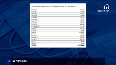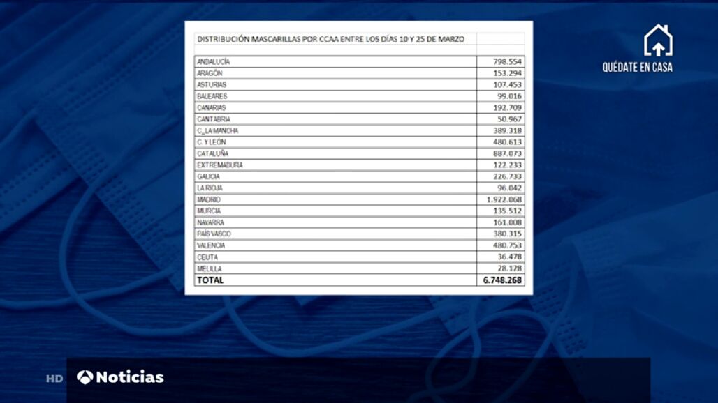 Según ese documento, las comunidades que más mascarillas recibieron fueron Madrid, Cataluña, Andalucía y Valencia.