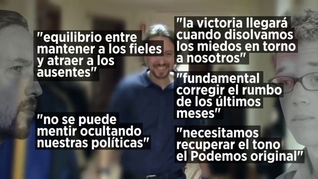Por su parte,Iñigo Errejón considera fundamental corregir el rumbo y recuperar el tono del Podemos original, menos agresivo y más dirigido a las instituciones. "No somos políticos", defiende Pablo Iglesias, mientras que Errejón considera que hay que ser útiles en las instituciones y subraya que "hay que explicar si el momento actual es de cavar trincheras o de avanzar".