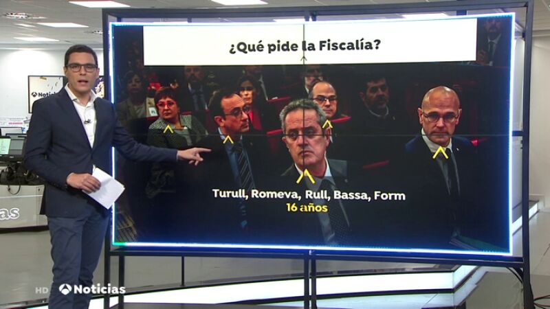 Para Junqueras piden hastas 25 años de cárcel. En cambio, para Forcadell, Sànchez y Cuixart la petición es de 17 años. Para Turull, Romeva, Rull, Bassa y Forn, la petición es de 16 años. Y para Vila, Borrás y Mundó, 7 años de cárcel. Estos últimos son lo que salieron del gobierno antes de la declaración de independencia.