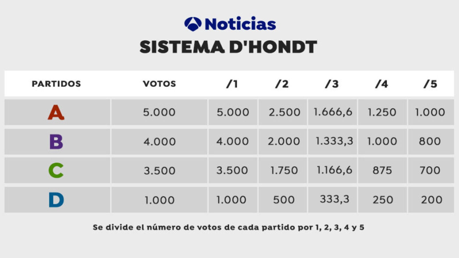 Lo primero que hace este sistema es eliminar aquellos partidos que vayan a obtener menos de un 5%. Este porcentaje es el umbral electoral exigido para obtener una representación. Por eso, se dice que favorece la composición de mayorías perjudicando a los partidos menos votados.