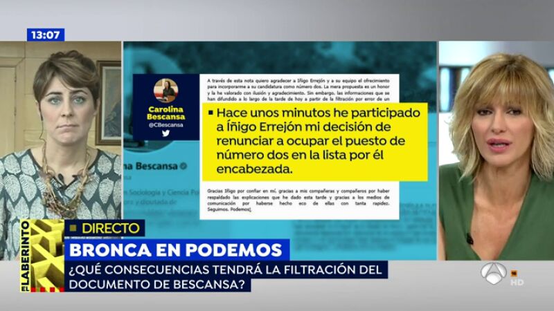 Lorena Ruiz-Huerta, portavoz de Podemos en la Asamblea de Madrid, ha dicho que le "apena" que en este momento lo que ocupa los medios de comunicación sea la renuncia de Carolina Bescansa a ir de número dos en la lista de Íñigo Errejón y no la polémica por el máster en la Universidad Rey Juan Carlos de Cristina Cifuentes. "Tenemos a tiro al PP. Tenemos la oportunidad de echarles", ha asegurado.