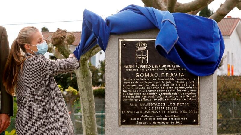 La localidad asturiana de Somao ha recibido con todos los honores hoy sábado la visita de los Reyes de España junto a las infantas, una visita en la que los monarcas han destapado una placa que distingue a este enclave asturiano como pueblo ejemplar de Asturias 2020.