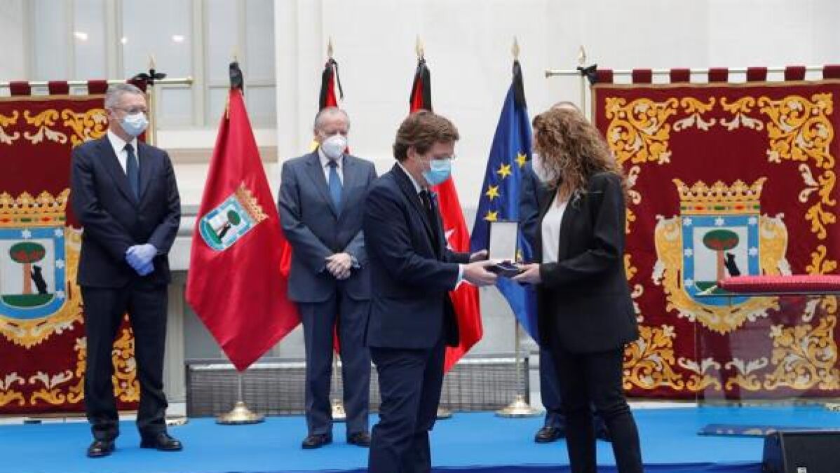 Ya en el Palacio de Cibeles se ha entregado la Medalla de Honor de la capital al conjunto de los madrileños por la "responsabilidad y solidaridad de todos en los momentos más críticos y desesperanzadores de la crisis sanitaria del coronavirus.