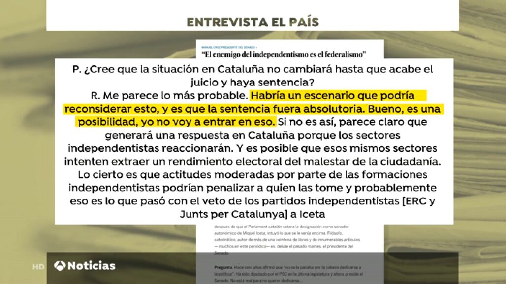 "Me parece lo más probable. Habría un escenario que podría reconsiderar esto, y es que la sentencia fuera absolutoria. Bueno, es una posibilidad, yo no voy a entrar en eso. Si no es así, parece claro que generará una respuesta en Cataluña porque los sectores independentistas reaccionarán", contesta Cruz en la transcripción correcta de la entrevista.
