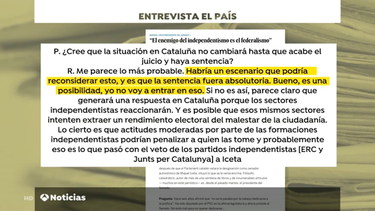 Dirigentes de PP y Ciudadanos han censurado al presidente del Senado, Manuel Cruz, por unas declaraciones sobre una hipotética absolución en el juicio del 'procés' recogidas en una entrevista en el diario El País cuya transcripción errónea fue posteriormente rectificada por el diario.