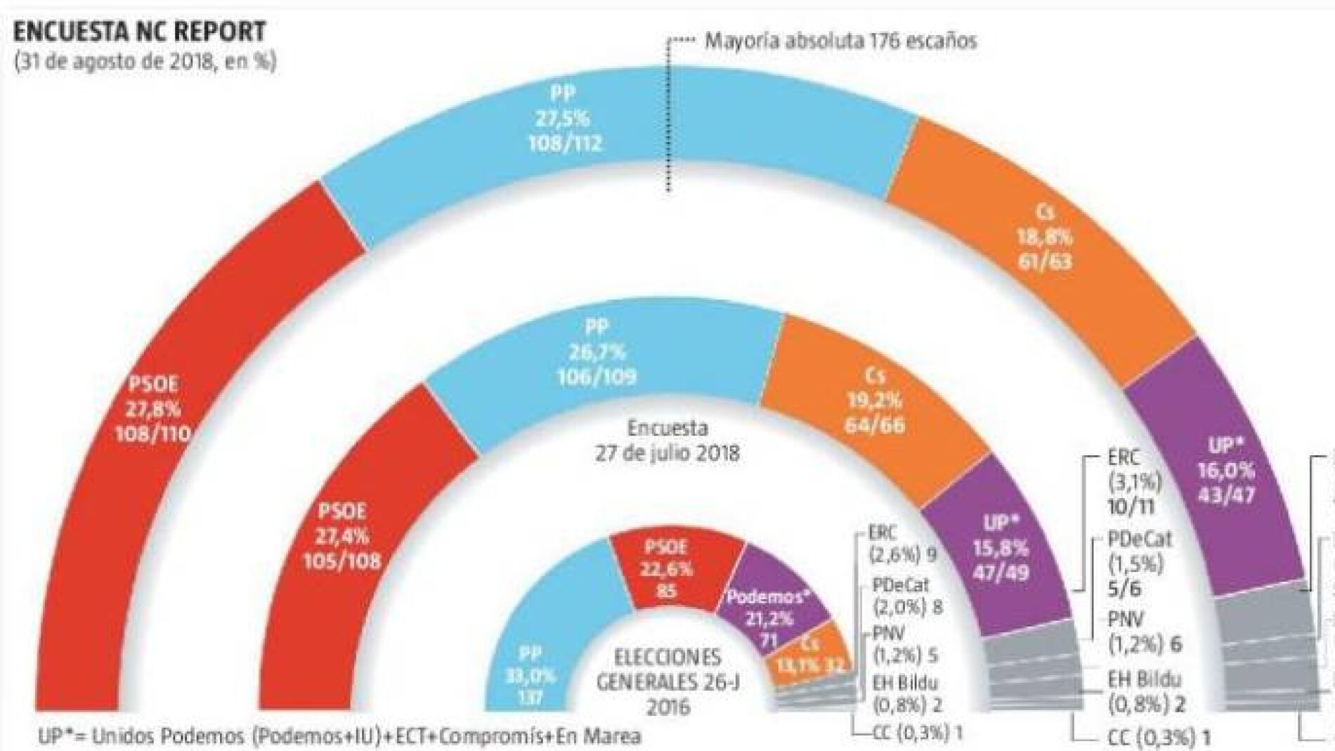 La gran caída de Podemos y el rechazo de los partidos independentistas llama la atención notablemente en la encuesta, con un 16% de intención de votos y convierte al partido naranja y su 18.8% en el árbitro de las próximas elecciones. Podría obtener entre 61 y 63 escaños mientras que el partido de Pablo Iglesias podría optar entre 43 y 47. Se observa una fuerte crecida en comparación a la pasada jornada electoral, en 2016, cuando Podemos superaba con creces al partido de Rivera.