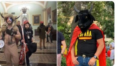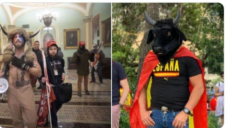 Miles de manifestantes con banderas de España y pancartas contra el presidente del Gobierno, Pedro Sánchez, han mostrado este domingo su rechazo a los indultos a los presos del 'procés'. La manifestación ha dejado algunas anécdotas que han sido comentadas en redes a golpe de meme. La vestimenta de algunos asistentes ha llamado la atención e incluso ha sido comparada con la que llevaron algunos de los asaltantes al Capitolio de EEUU.