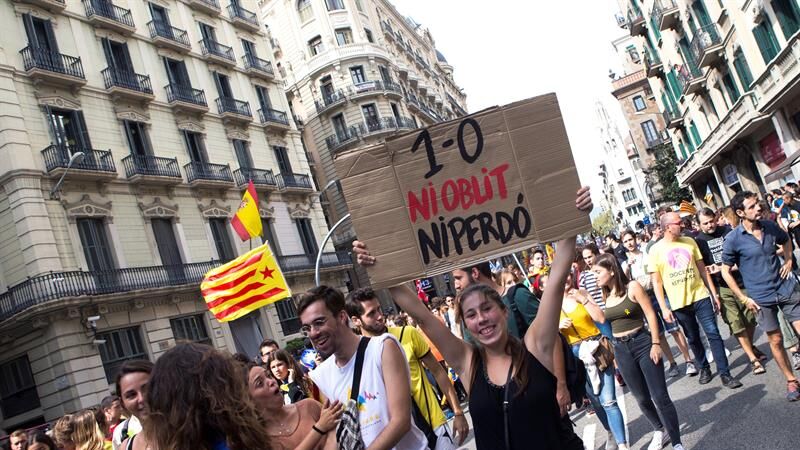 Al llegar la manifestación a la plaza Sant Jaume, las portavoces de 'Universitats per la República', Núria Marin y Núria Nieto, han reprochado que un año después del 1-O "la represión no se ha detenido", con investigados y los daños provocados por la aplicación del artículo 155 de la Constitución.