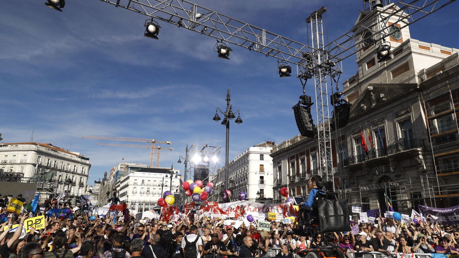 Miles de personas apoyan en la Puerta del Sol la moción de censura de Podemos