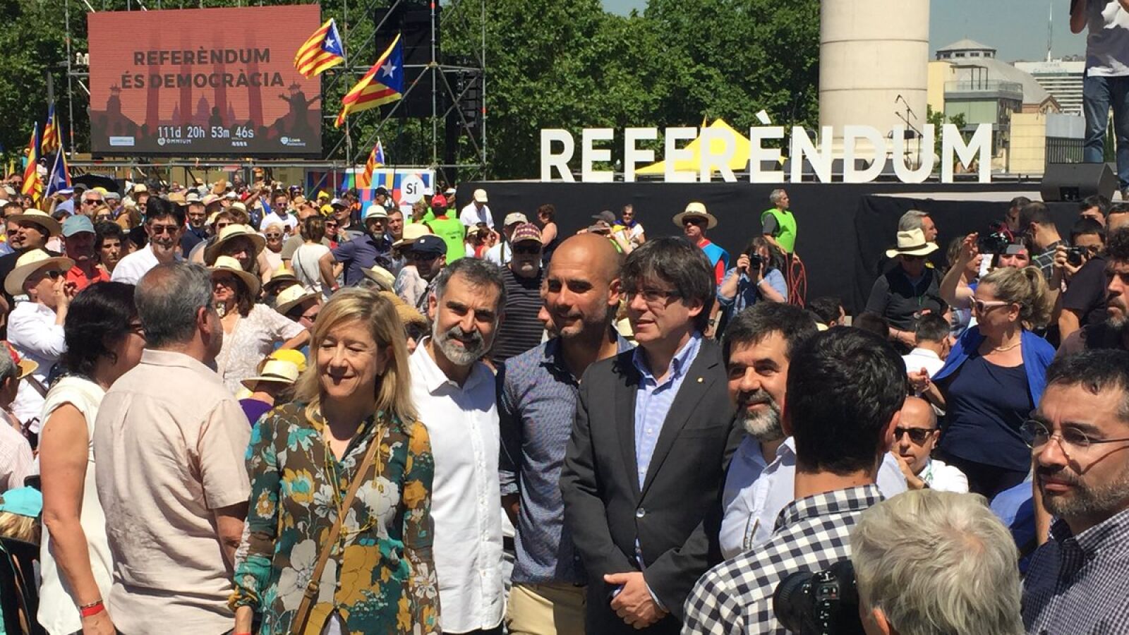 Bajo el lema 'Referéndum es democracia', miles de personas han apoyado el anuncio del presidente catalán, Carles Puigdemont, de celebrar un referéndum de independencia en Cataluña. En el acto ha participado el exentrenador del FC Barcelona Josep Guardiola, que ha asegurado que votarán "aunque el Estado no quiera".