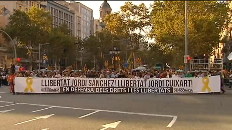 Unas 450.000 personas -según cifras de la Guardia Urbana de Barcelona- se han manifestado en el paseo de Gràcia de Barcelona, con una marcha convocada por la Taula per la Democràcia a favor de la libertad de los presidentes de la ANC y de Òmnium, Jordi Sànchez y Jordi Cuixart.