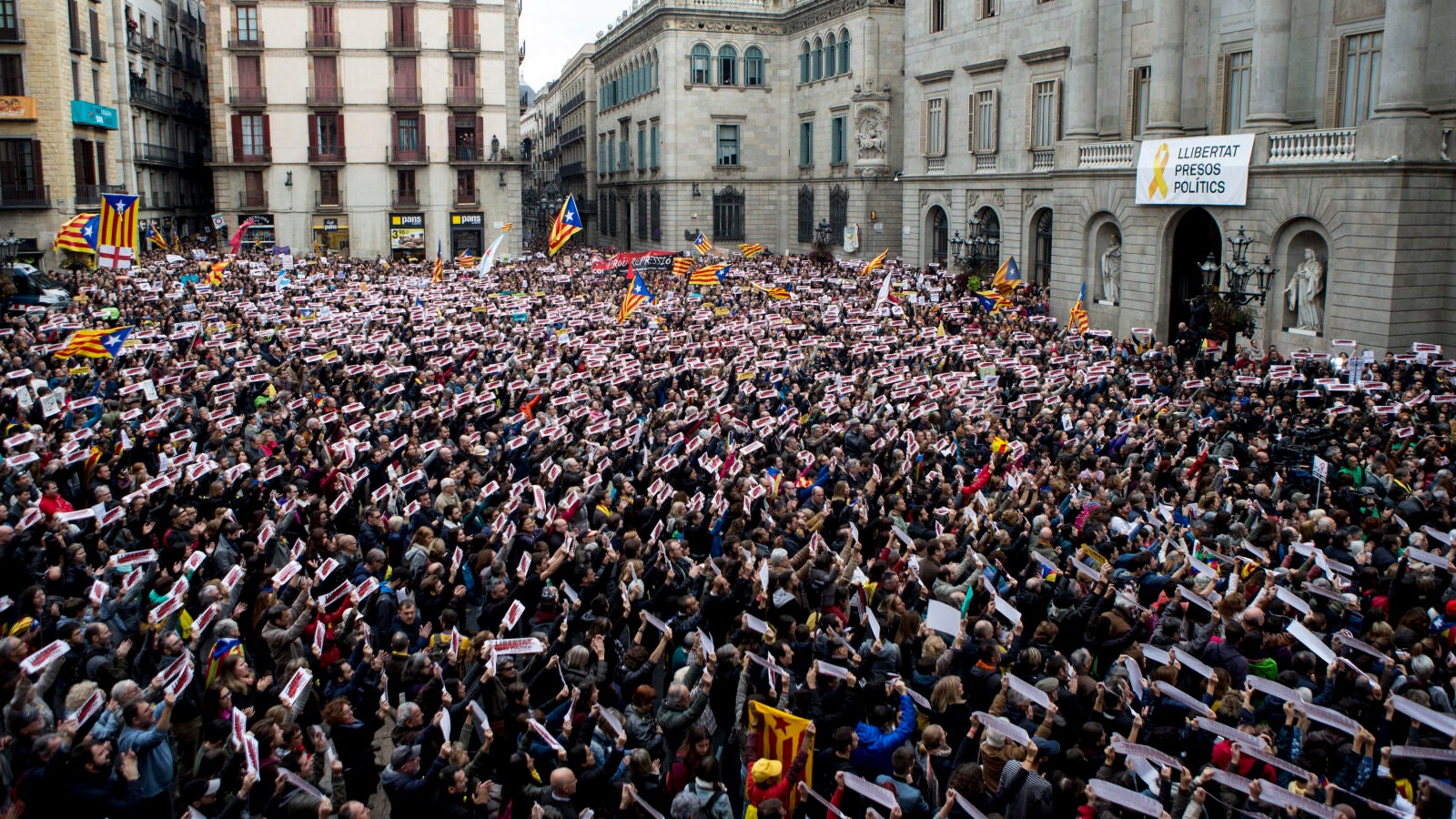 En la plaza de Sant Jaume, la principal de las concentraciones que se han celebrado en Cataluña, se han oído gritos como "es Puigdemont nuestro presidente", "libertad", "independencia" y silbidos cuando se han pronunciado el nombre del Gobierno y de la vicepresidenta, Soraya Sáenz de Santamaría.