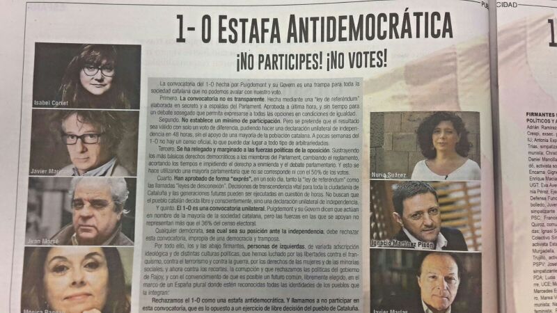 Califican esa cita como una estafa democrática y llaman a la ciudadanía a no participar. Aseguran que carece de transparencia y se ha aprobado de manera unilateral. Entre los firmantes se encuentran escritores como Javier Marías o Juan Marsé y artistas como Miguel Ríos o Rosa Maria Sardá. El manifiesto aparece como publicidad en un diario nacional y ha sido pagado por quienes le secundan, la mayoría de ellos conocidos por sus posiciones de izquierda.