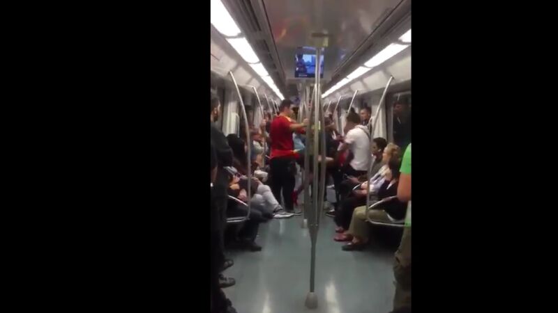 En el vídeo, colgado en las redes sociales, se ve a un grupo de ultras discutiendo con usuarios del metro, hasta el punto de que uno de los jóvenes, vestido con una camiseta azul de la selección española, intenta golpear con la cabeza al pecho de uno de sus oponentes, tras decirle: "¡voy a por ti!".