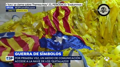 Es la primera vez en la que una cámara de televisión ha accedido a la nave en la que los 'quitalazos' han estado almacenando los lazos que han estado quitando por las calles de Cataluña en estas últimas semanas.