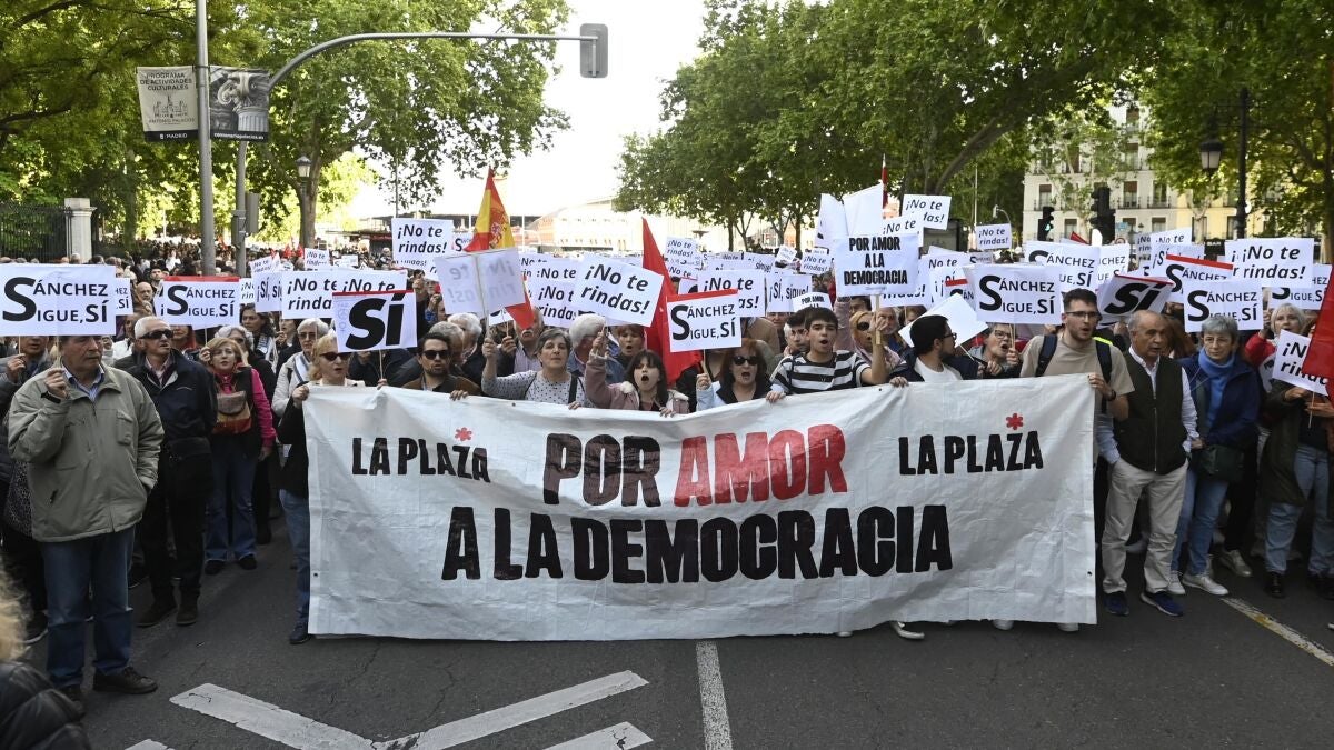 La concentración ha comenzado en la Cuesta de Moyano y se ha dirigido hasta el Congreso de los Diputados. El objetivo: pedir a Pedro Sánchez que no dimita y "en defensa de la democracia". La convocatoria está bajo la autoría de la organización La Plaza y quiere subrayar su apoyo al presidente del Ejecutivo y denunciar el "lawfare" contra el Gobierno. Uno de los portavoces de la organización, José Luis Martínez, ha asegurado a los periodistas que han convocado esta manifestación para denunciar que "el PP y su poder mediático y judicial son una mafia". "No podemos normalizar que hayan medios de comunicación que crean bulos capaces de tumbar un Gobierno democrático y no podemos normalizar que haya jueces que hagan más política que justicia", sentencia.