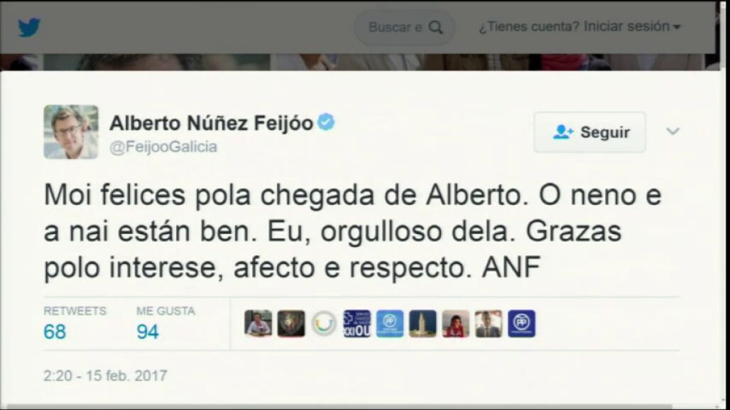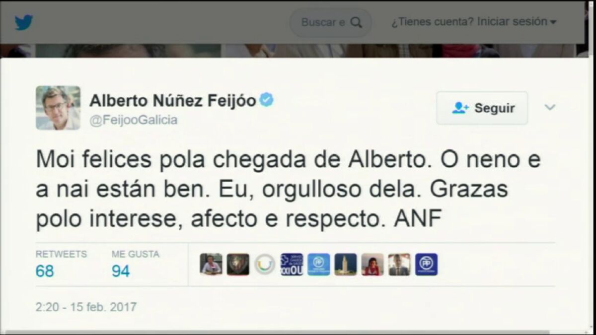 "Muy felices por la llegada de Alberto. El niño y la madre están bien. Yo, orgulloso de ella. Gracias por el interés, afecto y respeto", ha tuiteado el presidente de Galicia.