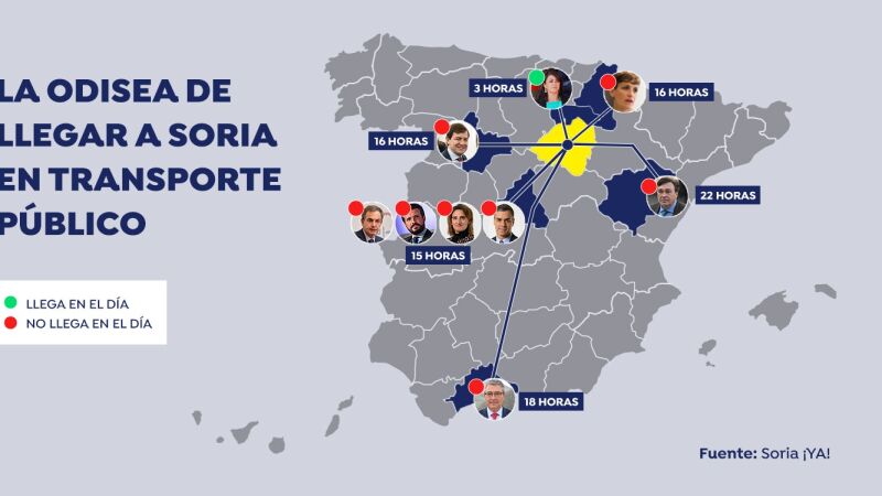 En ese contexto, y con el objetivo de denunciar la precaria situación del transporte público en la provincia, la plataforma Soria ¡YA! ha elaborado una infografía con las horas que tardarían en llegar al acto cada uno de los políticos y empresarios desde su lugar de trabajo.