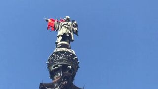 Dos escaladores, activistas de la organización Proactiva Open Arms, han colocado esta mañana un chaleco salvavidas gigante en la estatua de Cristóbal Colón en Barcelona, coincidiendo con la llegada al puerto de la ciudad del barco Open Arms con 60 inmigrantes a bordo.