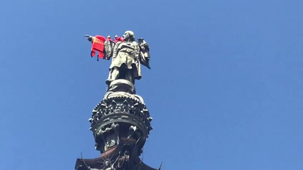 Los dos escaladores han colocado el chaleco, de color naranja y con las letras Open Arms escritas en negro, en el brazo extendido del emblemático monumento barcelonés, ante la expectación de los numerosos turistas que transitan por la zona.