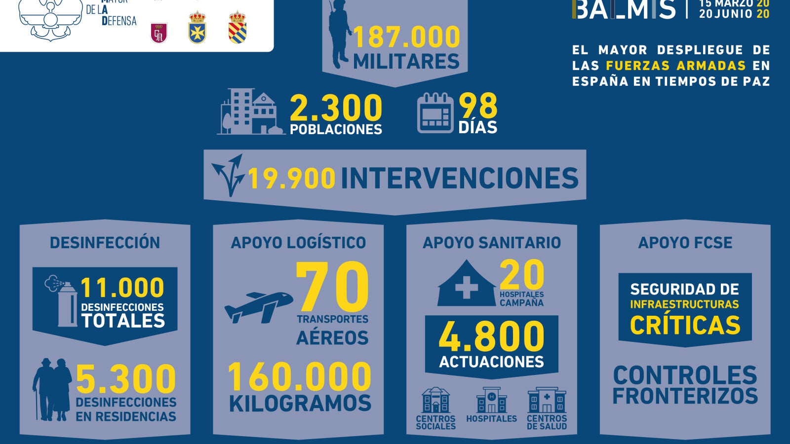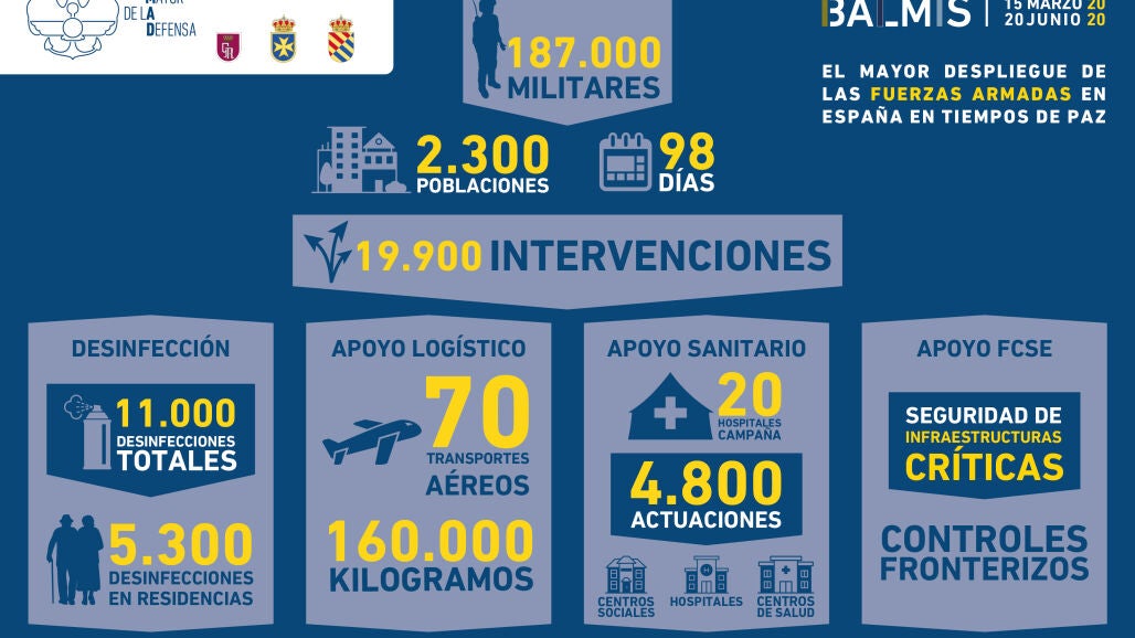 La Operación Balmis, despliegue militar por la pandemia de coronavirus en España, acaba este sábado tras 98 días y la participación de 187.000 militares. Estas son todas las cifras que nos ha dejado la actuación histórica de las Fuerzas Armadas.