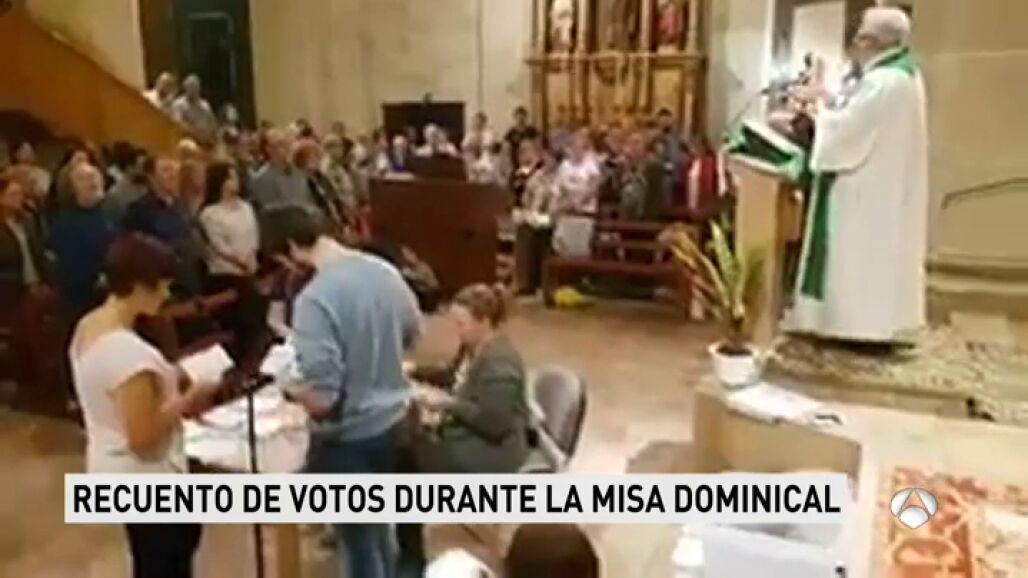 Ocurrió en una iglesia de Vila-Rodona, en Tarragona. Un grupo de personas situadas frente al altar realizan el escrutinio de las papeletas mientras el párroco y los feligreses cantan.