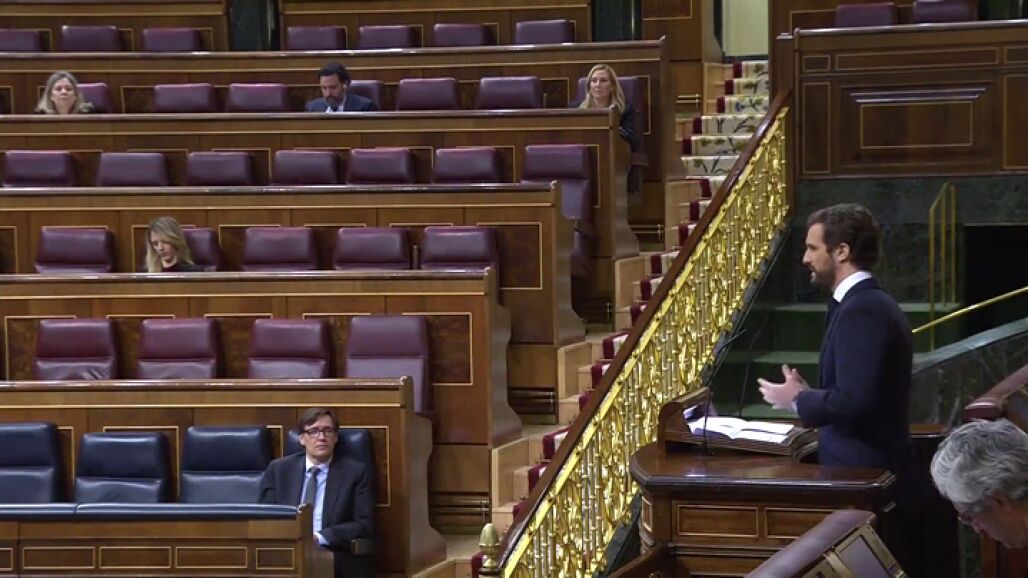 El líder del Partido Popular, Pablo Casado, ha comparecido en el Congreso de los Diputados tras la declaración del presidente del Gobierno, Pedro Sánchez, donde ha pedido la prórroga del estado de alarma por el coronavirus hasta el 9 de mayo.