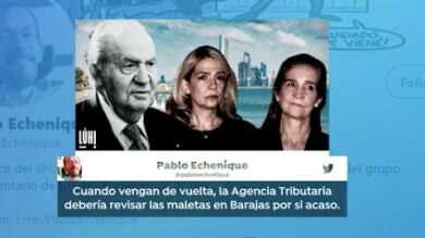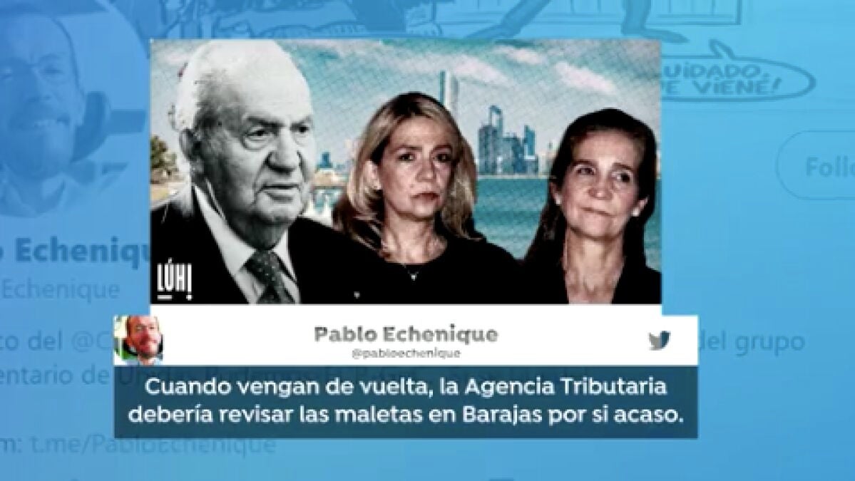 Desde Unidas Podemos, Pablo Echenique ha recomendado a través de Twitter a la Agencia Tributaria que cuando vuelvan a España, les revisen las maletas. "Cuando vengan de vuelta, la Agencia Tributaria debería revisar las maletas en Barajas por si acaso", ha escrito el portavoz de Unidas Podemos en el Congreso.
