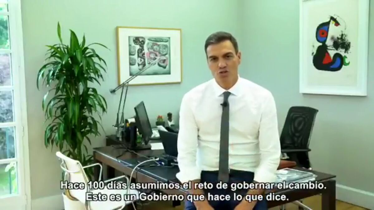Pedro Sánchez hace un balance sobre los 100 días de Gobierno. Ha afirmado que lo que ha prometido el gobierno, se ha llevado a cabo y aplaude a su gobierno las medidas que se han llevado a cabo contra la violencia de género.