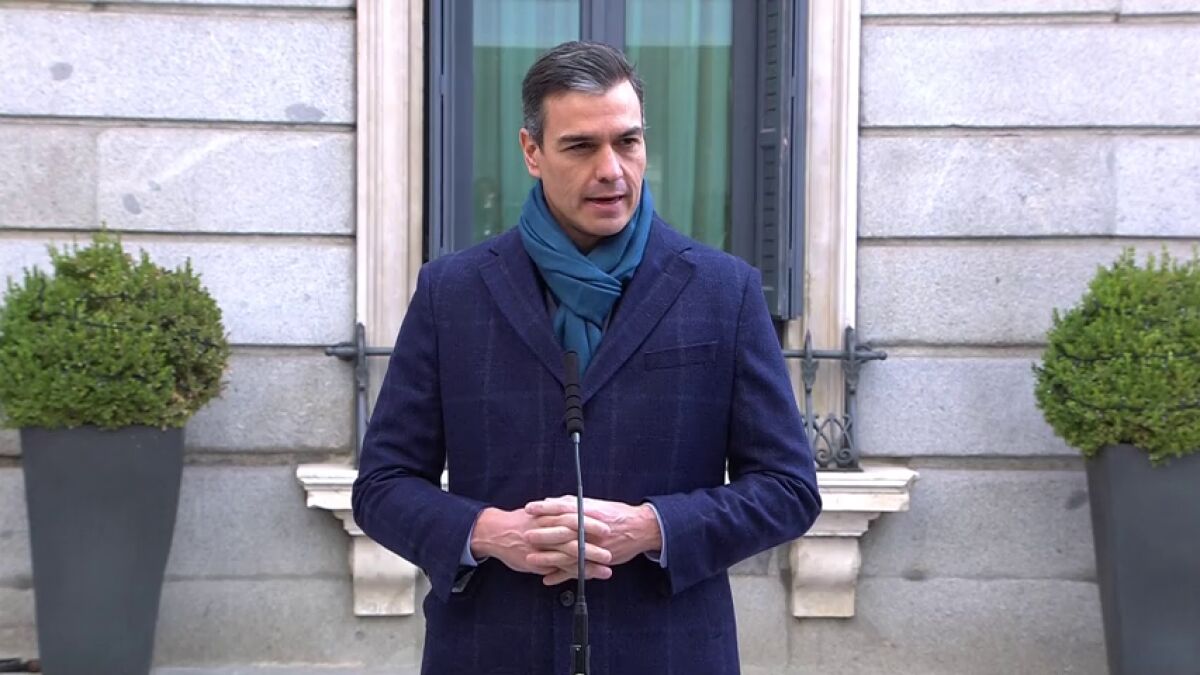 El presidente del Gobierno, Pedro Sánchez, destaca las razones para celebrar la vigencia de la Constitución en una declaración sin preguntas que tuvo que repetir al fallar el sistema de sonido instalado en el patio del Congreso de los Diputados.