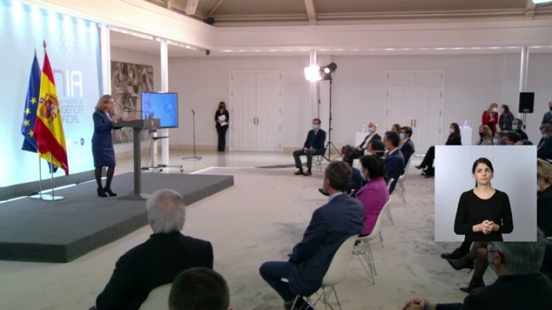 El presidente del Gobierno, Pedro Sánchez, presenta este miércoles la Estrategia Nacional de Inteligencia Artificial en el Complejo de la Moncloa, acompañado por la vicepresidenta tercera y ministra de Asuntos Económicos y Transformación Digital, Nadia Calviño; la ministra de Educación y Formación Profesional, Isabel Celaá, y la ministra de Industria, Comercio y Turismo, Reyes Maroto.