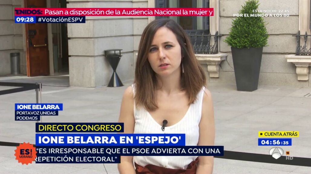 Respecto a una posible repetición de elecciones, Belarra considera "irresponsable que el PSOE advierta con una repetición electoral" y admite que la situación "tiene mala pinta".
