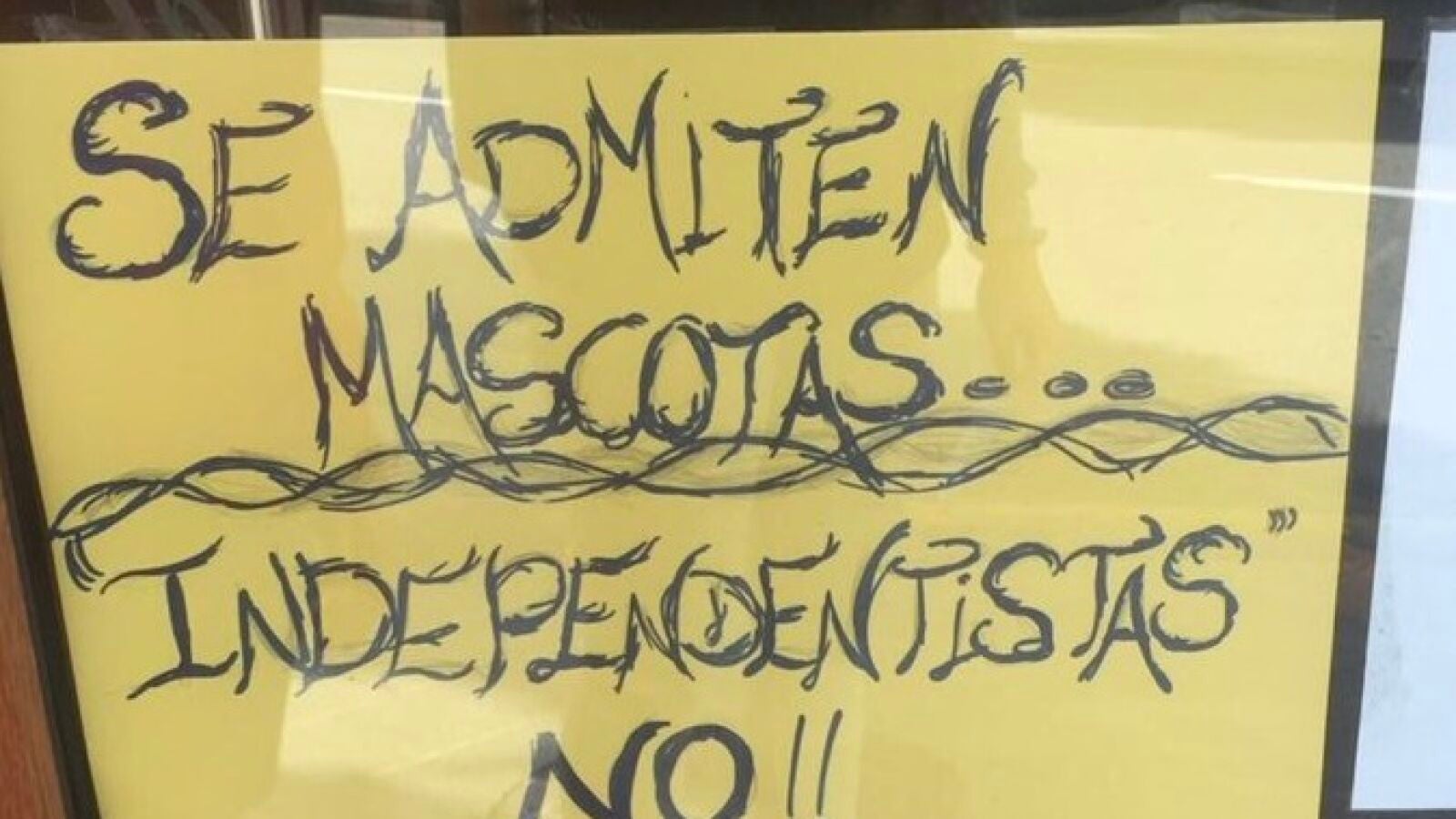 Se trata del cartel de una cafetería de Gijón en el que se puede leer "Se admiten mascotas... Independentistas no", trasladando de esta manera el conflicto social y político que se vive en Cataluña tras las pretensiones independentistas el Govern de la Generalitat cesado, tal y como recoge el medio 'El Comercio'.