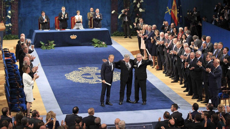 Jean Claude Juncker calificó de "visión hermosa" las numerosas banderas de España que observó en edificios y entre la gente durante el recorrido desde el Hotel de la Reconquista al Teatro Campoamor. "La paz es una conquista de todos los días", advirtió, añadiendo que Europa es "la mejor fortificación frente a los dramas del pasado". Rajoy miró a Juncker y elevó los dos pulgares tras su discurso.