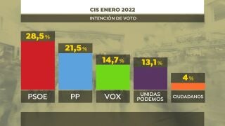 El Centro de Investigaciones Sociológicas (CIS) vuelve a dar como ganador al PSOE en unas hipotéticas elecciones generales en su primera encuesta de 2022. Según una encuesta publicada este jueves, el partido de Pedro Sánchez se haría con el 28,5% de los votos si hoy se celebrasen elecciones generales, mientras que la formación de Pablo Casado obtendría el 21,5%.