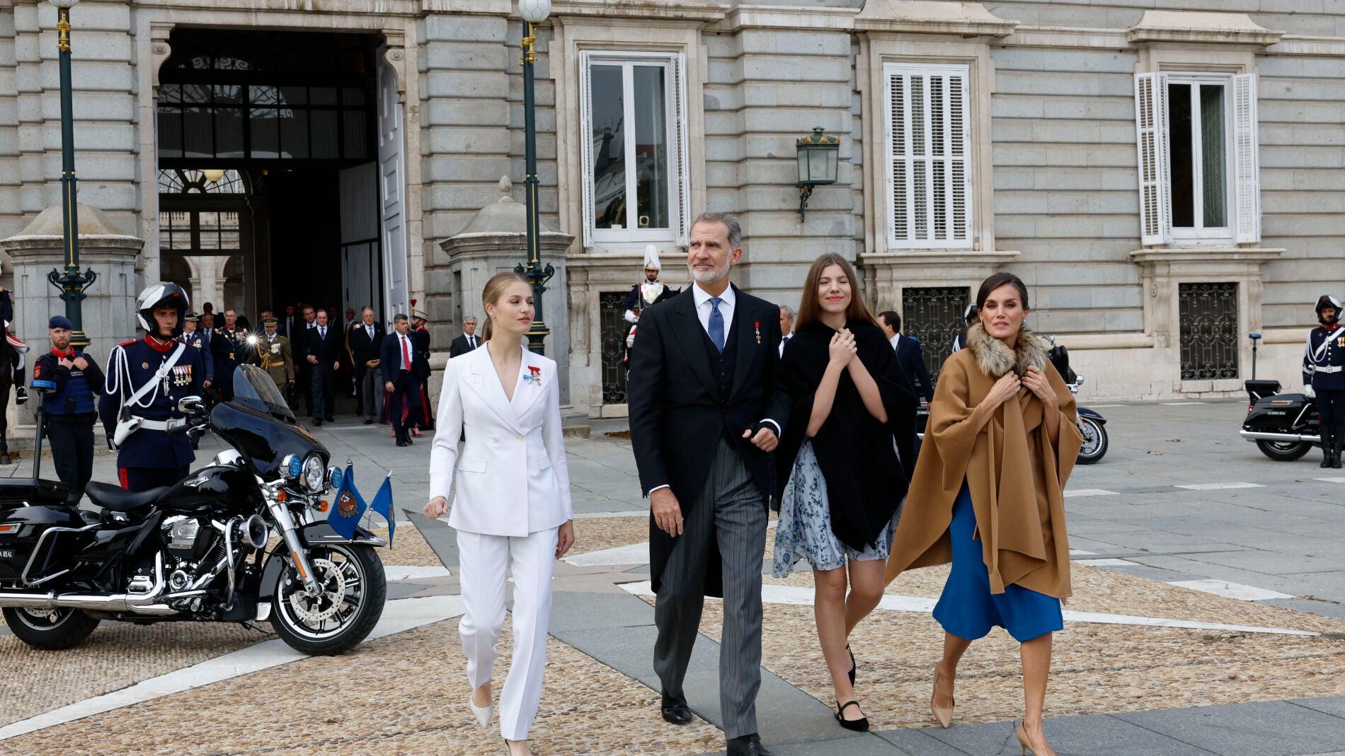 Los reyes Felipe VI y Letizia salen ya del Palacio de la Zarzuela acompañados de la Princesa Leonor y la Infanta Sofía.