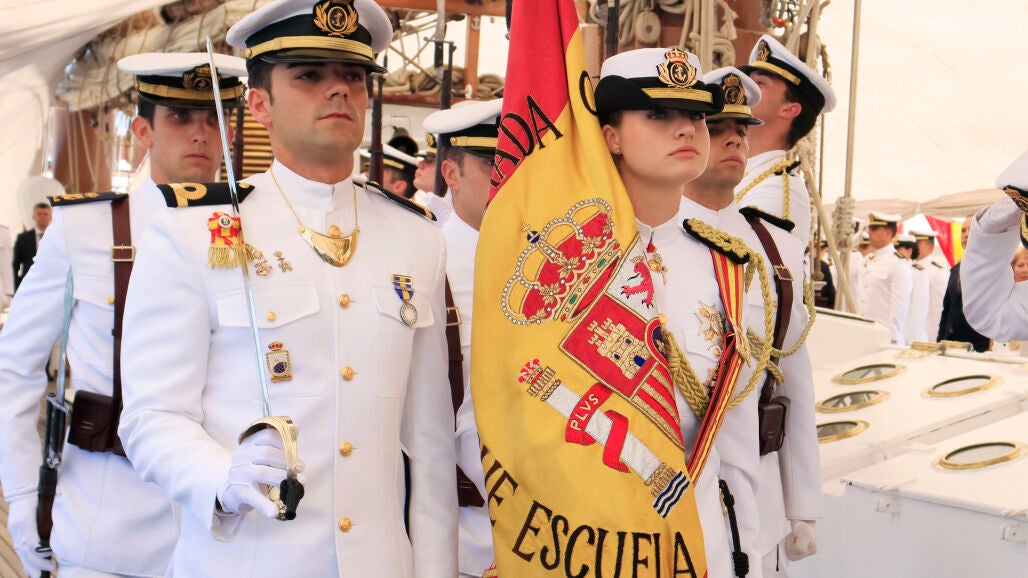 La heredera al trono ha sido la encargada de portar la bandera nacional durante el acto, celebrado en la popa del emblemático velero, como parte de su instrucción.