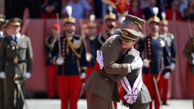Los hemos visto fundirse en un respetuoso abrazo entre padre e hija y después, la princesa se ha dirigido a la tribuna, desde donde iba a presenciar la entrega de los Despachos Reales a los 456 tenientes que finalizan la carrera militar. Allí la esperaban su madre, la Reina Letizia, y su hermana, la infanta Sofía. Con ellas también se ha intercambiado besos y abrazos.